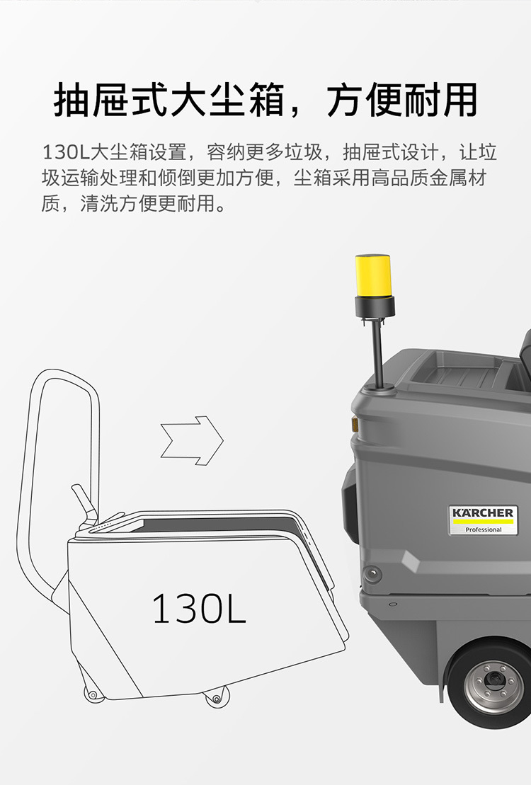 130L大塵箱配置,容納更多垃圾,抽屜式設(shè)計(jì),讓垃圾運(yùn)輸處理和傾倒更加方 便,塵箱采用高品質(zhì)金屬材質(zhì),清洗更方便,耐用。