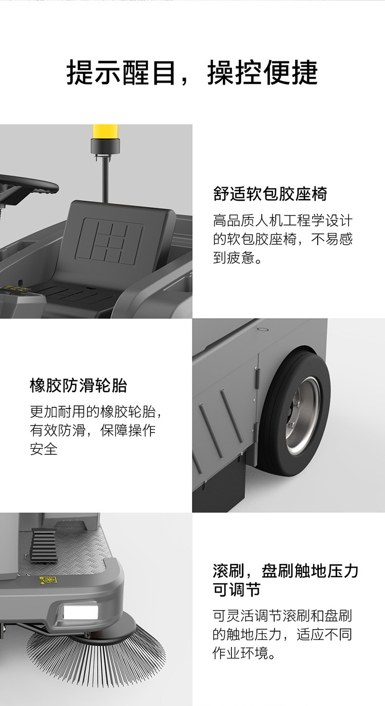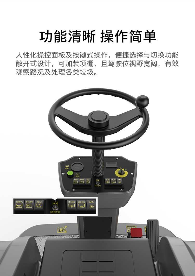 敞開(kāi)式設(shè)計(jì),可加裝頂棚,駕駛式視野極佳,可以有效判斷路口,觀察處理各種 地面垃圾。按鍵式操控按鈕,讓功能選擇和切換都非常簡(jiǎn)單,讓清潔更加輕松, 舒適。